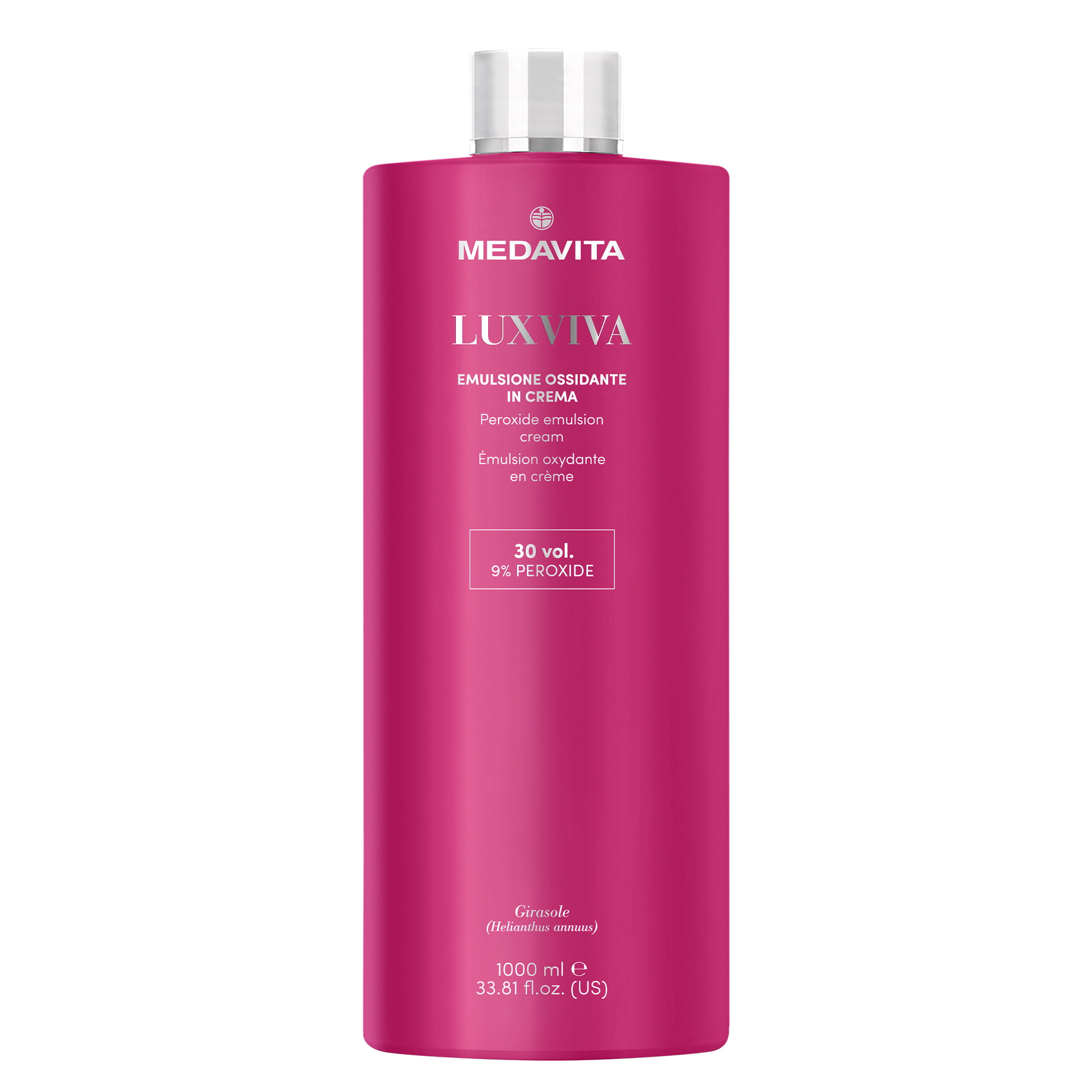 - У неметалевій посудині змішайте одну частину крем-фарби Luxviva з півтора частинами 10 VOL (3%), 20 VOL (6%), VOL (9%) або 40 VOL (12%) Luxviva Emulsione Ossidante від MEDAVITA.