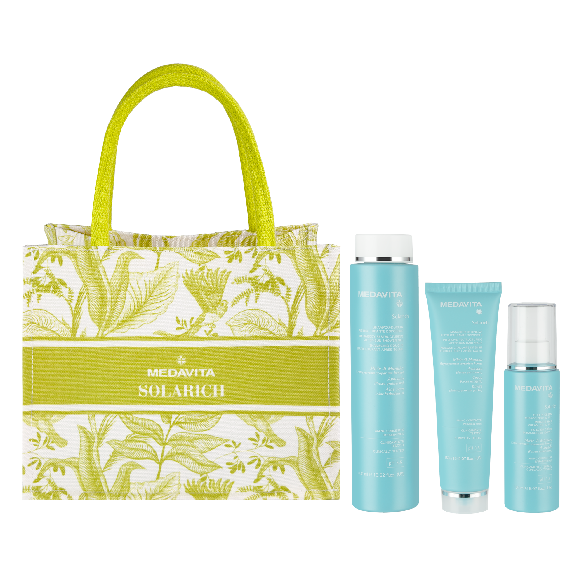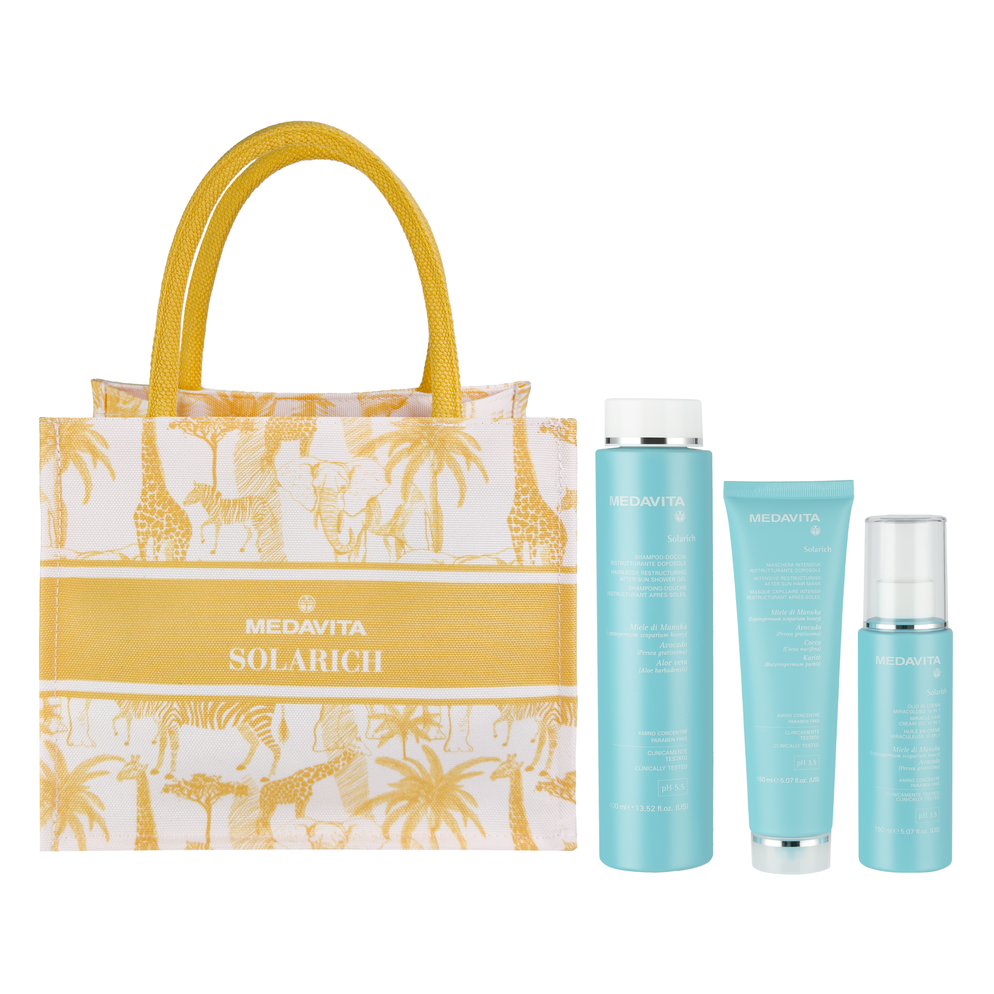 У наборі: відновлювальний шампунь і гель для душу, інтенсивна маска після сонця, сонцезахисний крем для волосся 10 в 1 із дзеркальним ефектом та пляжна сумка.