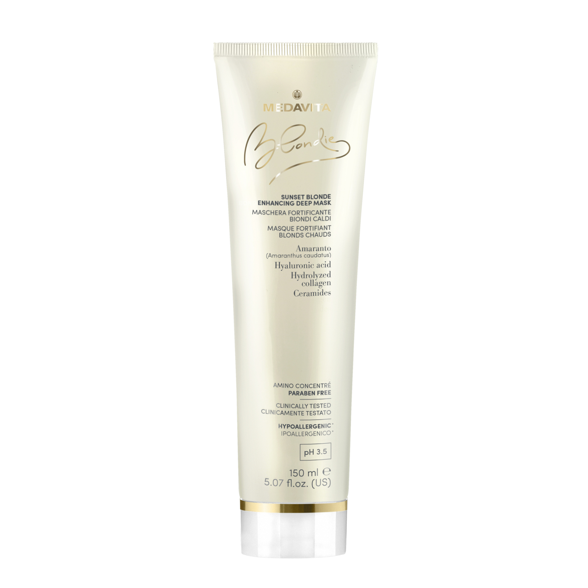Живильна маска для підсилення теплих відтінків блонду (pH 3,5) захищає і підсилює теплі відтінки блонду, а також відновлює та реконструює структуру волосся. Її формула була спеціально розроблена для того, щоб відповідати всім потребам освітленого та знебарвленого волосся. Маска містить пігменти, які підкреслюють золотисті, золотисто-мідні та медові відтінки. Вона інтенсивно живить, зволожує та ущільнює чутливе блондоване волосся, насичує його протеїнами та амінокислотами, створює захисну мантію.