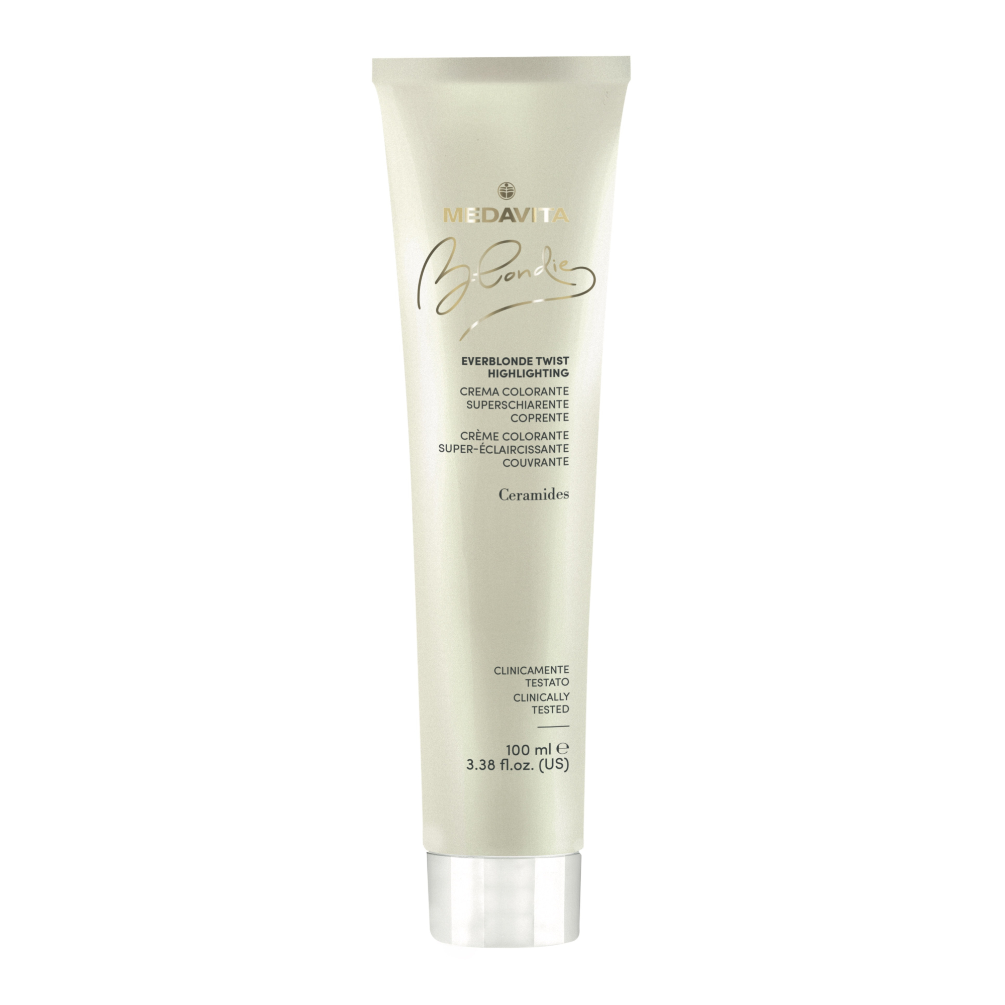 Суперосвітлювальна крем-фарба для зафарбовуваня сивини Medavita Blondie Everblonde twist highlighting – ідеально підходить для підняття глибини тону натуральної бази на 4–5 рівнів і фарбування сивого волосся, внаслідок чого досягається рівномірний натуральний тон. Рекомендується застосовувати для фарбування волосся із сивиною до 70%