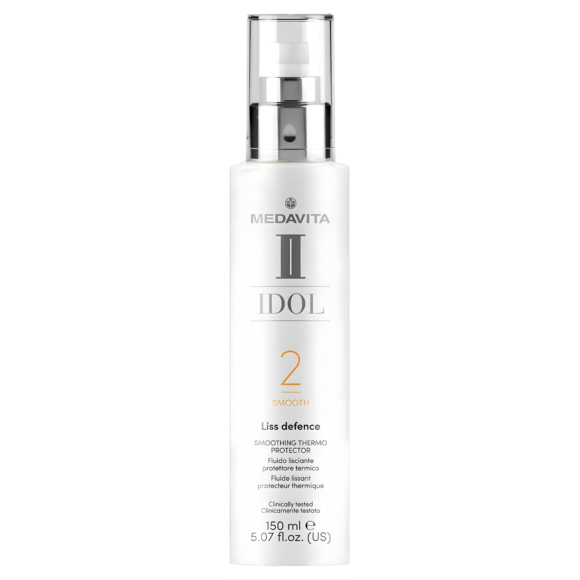 Idol Smooth Liss Defence — легка термозахисна розгладжуюча рідина. Усуває пухнастість, запечатує кутикулу волосся, захищаючи волосяні волокна від надмірного висихання, зневоднення та високих температур під час використання фену, праски для волосся чи під впливом атмосферних чинників. Робить волосся ідеально гладким та надає блиску. Скорочує час висихання волосся.