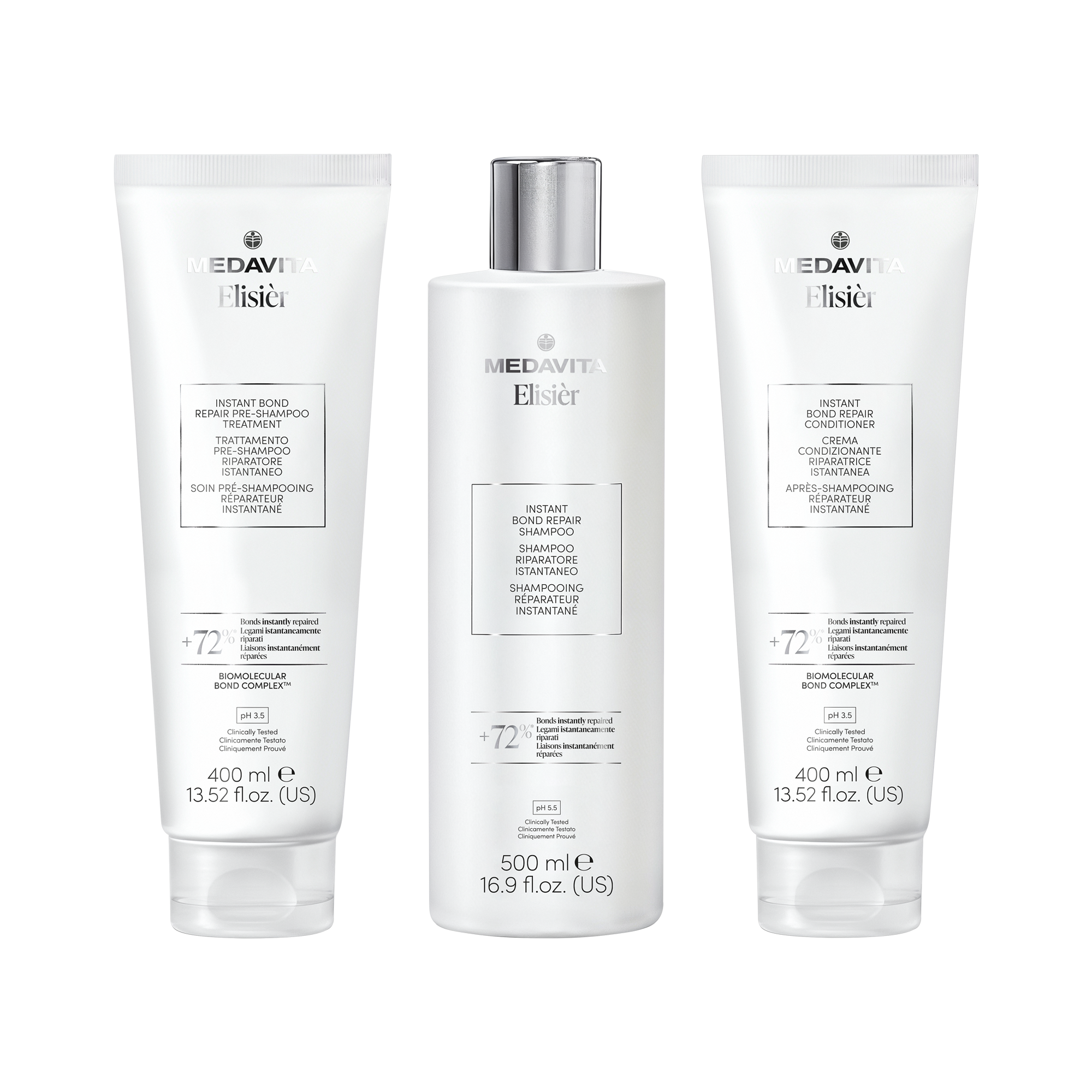 MEDAVITA ELISIÈR INSTANT BOND миттєво відновлює пошкоджене волосся. Продукт належить до інноваційної категорії відновлення зв’язків і працює на структурному рівні, реконструюючи зв’язки волосся, ослаблені хімічними процедурами, термічним укладанням, а також щоденним впливом довкілля та механічним стресом.