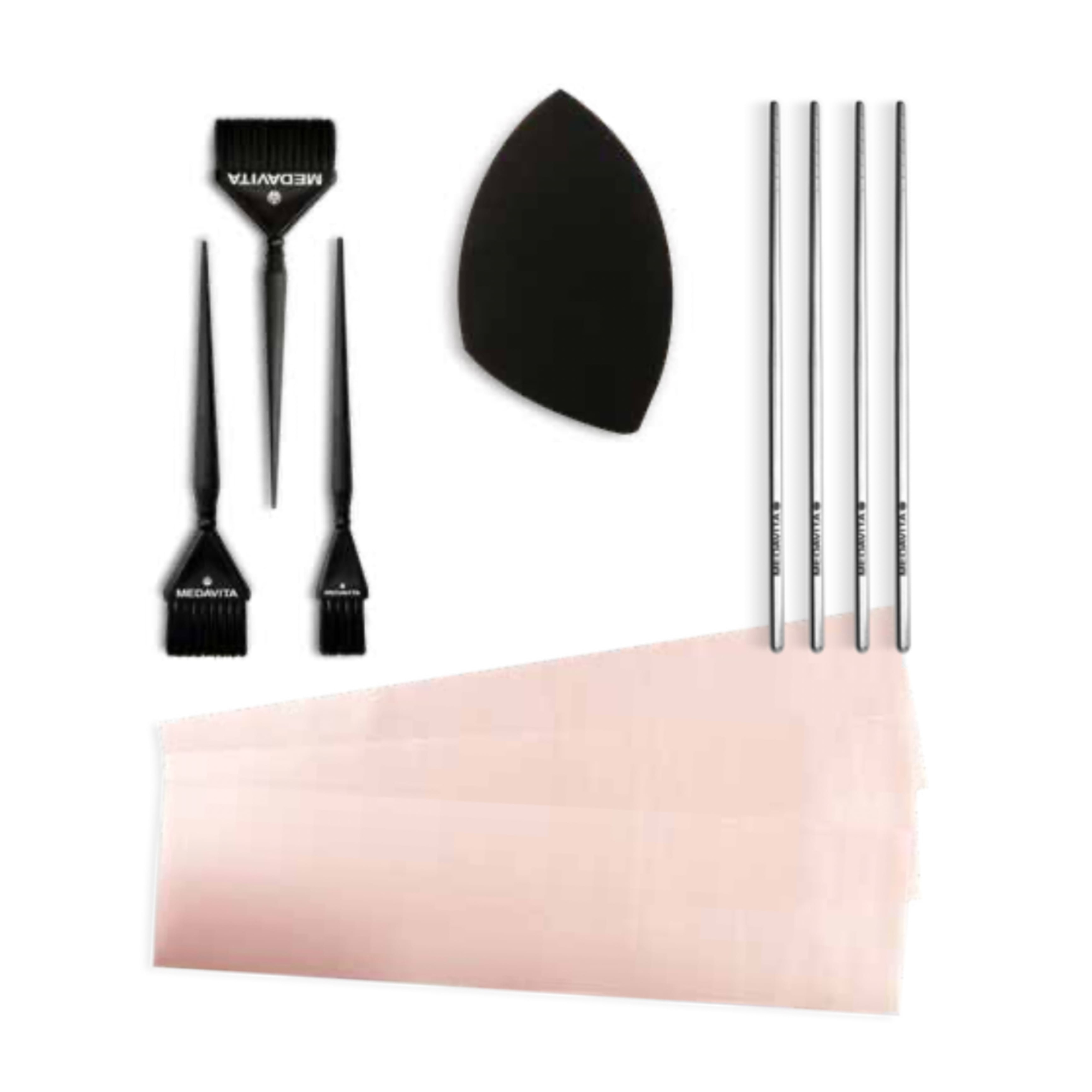 У комплекті: спонж, маленький пензлик для фарбування, середній пензлик, великий пензлик, рожева багаторазова фольга та спиці для складних технік фарбування.