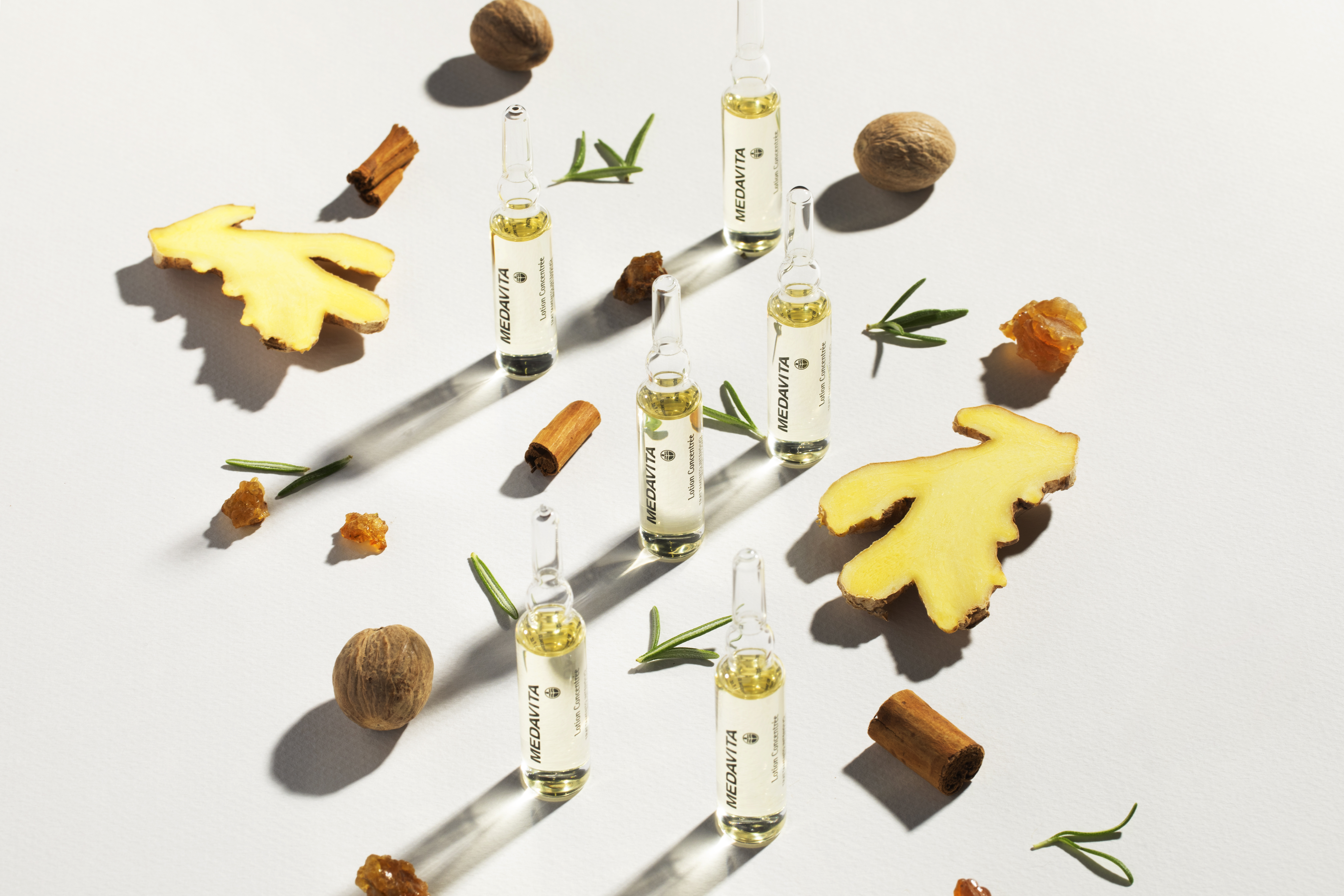 Lotion Concentrée на 100% складається з натуральних інгредієнтів, які мають потужну антивікову дію. Фактично це еліксир із рослинних екстрактів, властивості яких вивчені у лабораторіях MEDAVITA: розмарин, ментол, арніка, кориця, імбир, камфора, алое, каламус, гальбан, мирра, мускатний горіх, саліцилова кислота, бензоїн, гвоздика, куркума та калган.