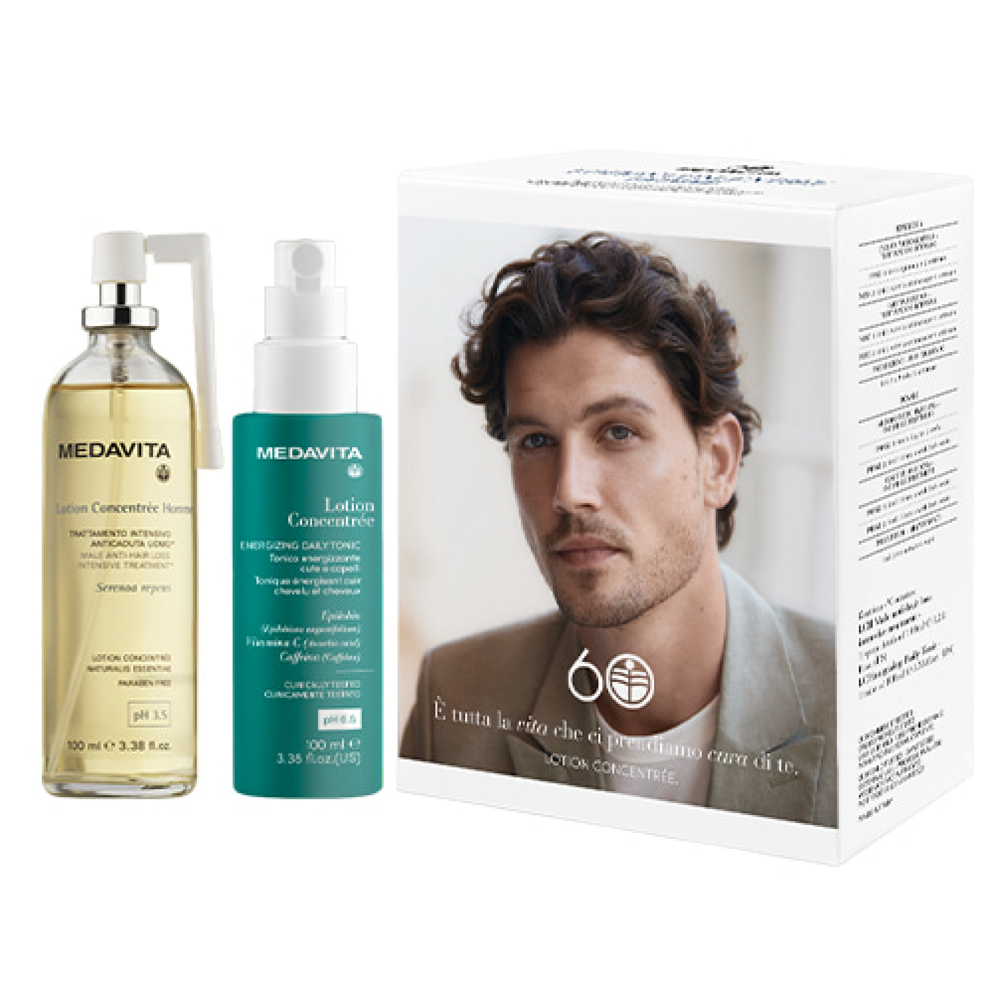 Набір LOTION CONCENTRÉE HOMME містить усі засоби необхідні для домашнього догляду під час інтенсивного курсу лікування андрогенетичної алопеції та для підтримки досягнутого результату